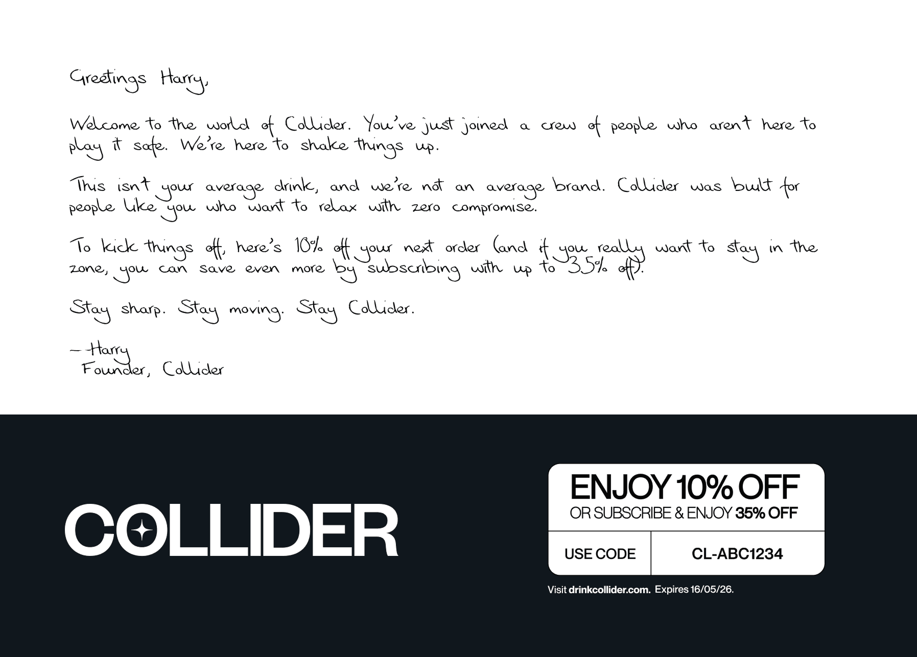 Co-founded by Harry Cooke, Collider has rapidly built a loyal following in the functional drinks space. Their product does the heavy lifting. When something actually works, customers come back. The question is how to make sure they do.