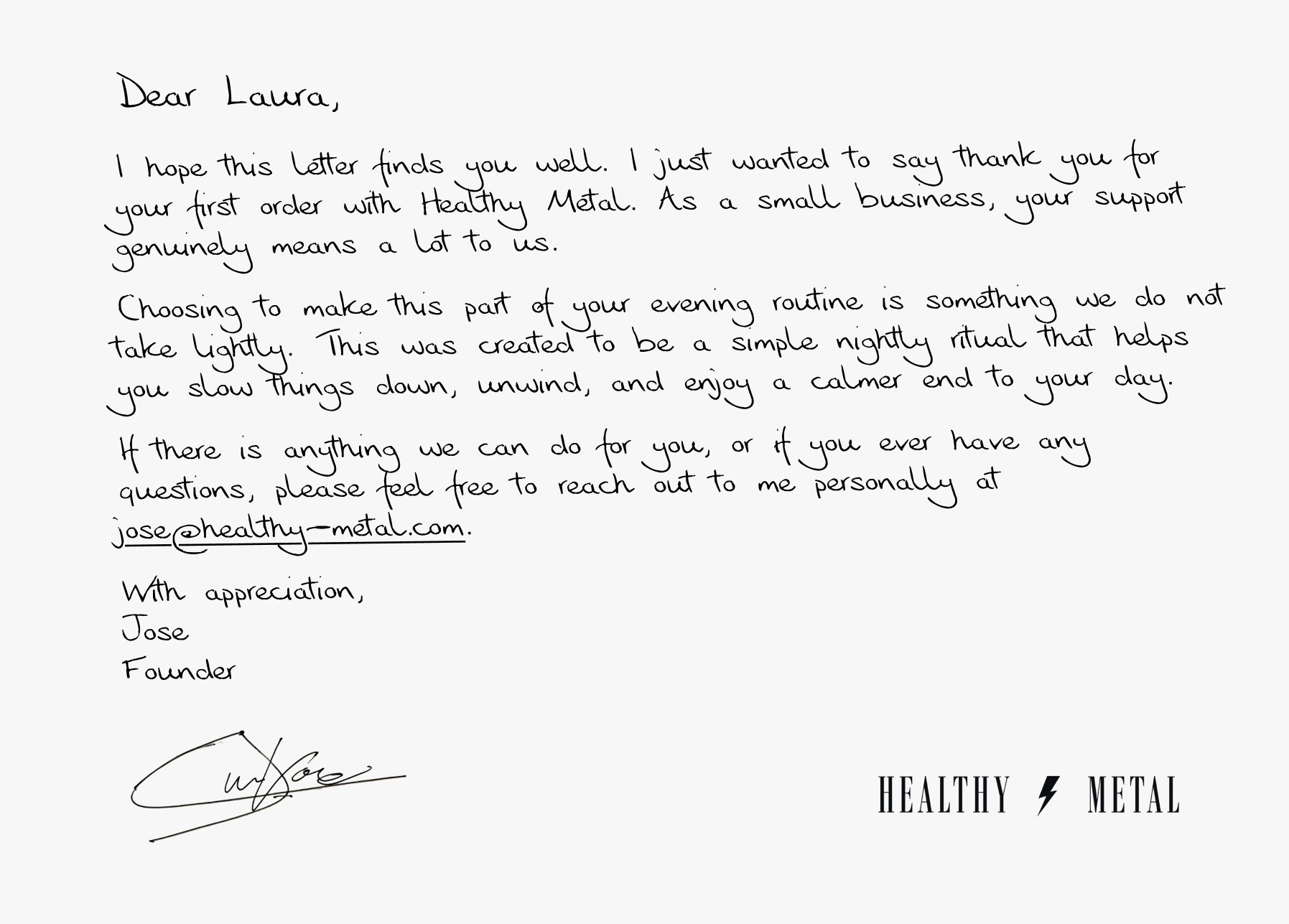 Healthy Metal launched an automated thank you note flow with Paper Run, targeting every first-time customer. Three days after their order, timed to land as the product is becoming part of their nightly ritual, each customer receives a personalised postcard that leads with warmth over promotion.