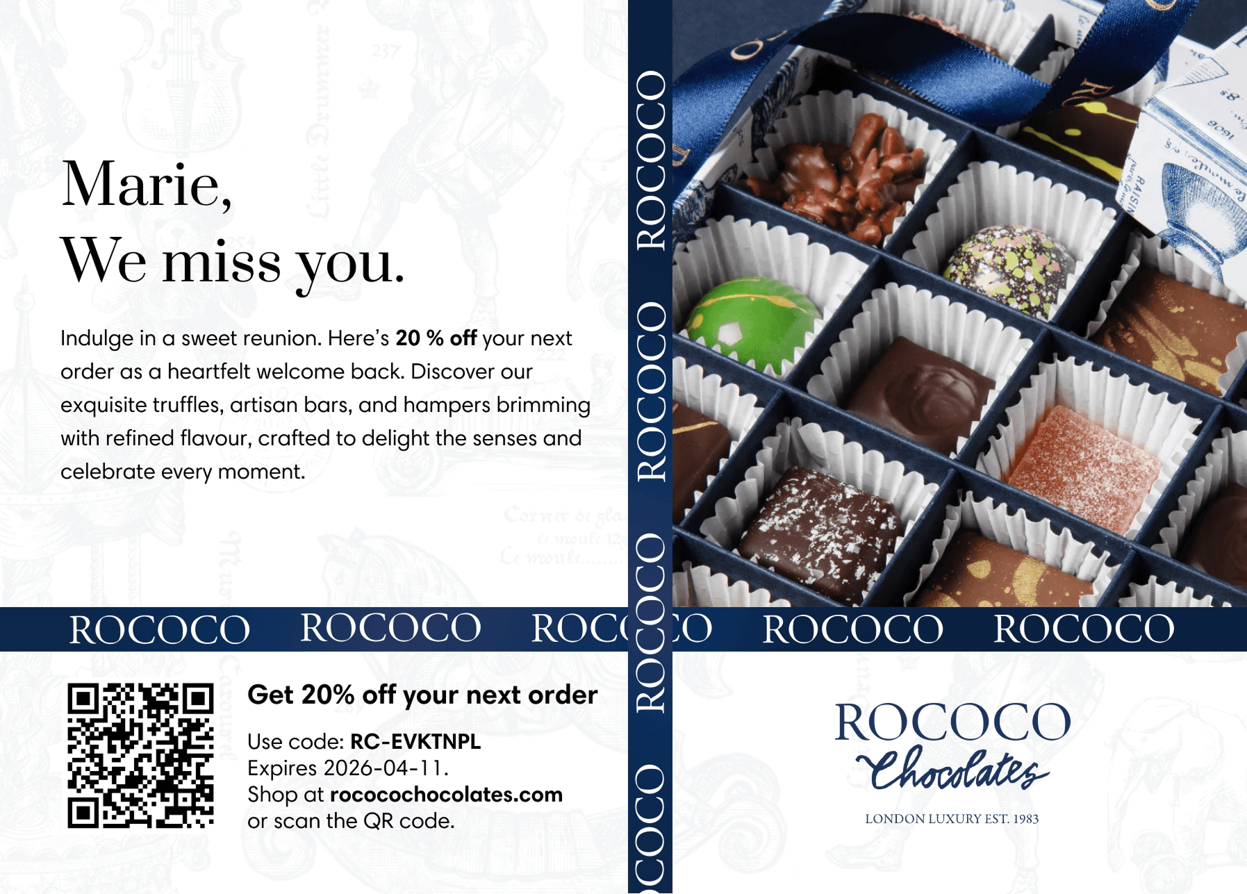 The churn winback flow is delivering exceptional performance. Customers who had gone quiet online are re-engaging through physical mail, responding to the creative, the offer and the unmistakable Rococo name. The flow continues to convert lapsed customers into repeat buyers with consistency and scale.
